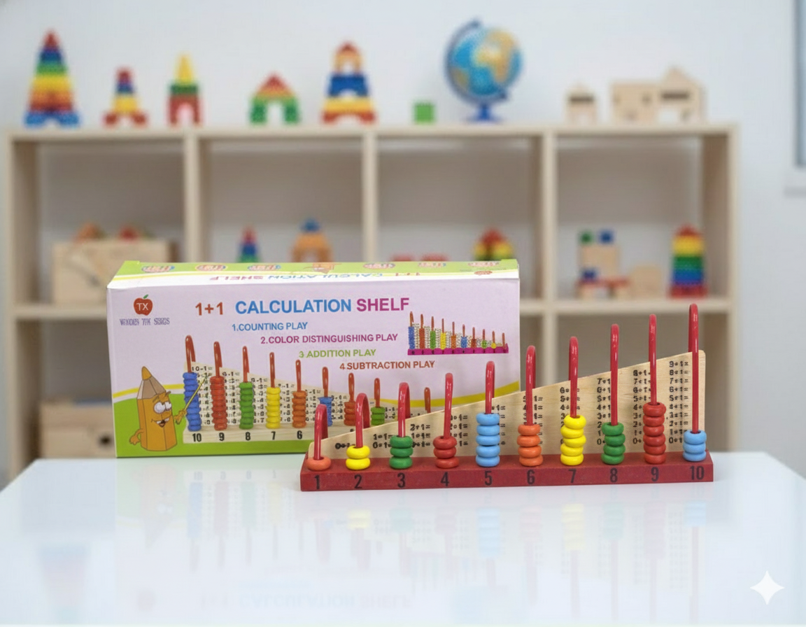 Calculation Shelf es un ábaco estructurado con columnas numeradas y fichas de colores que facilitan la comprensión de los conceptos matemáticos básicos mediante la manipulación directa. Incluye tarjetas con operaciones visibles, lo que permite pasar del conteo concreto al pensamiento lógico-matemático inicial. Es ideal para niños que están iniciando procesos de cálculo o que presentan dificultades en el aprendizaje matemático.