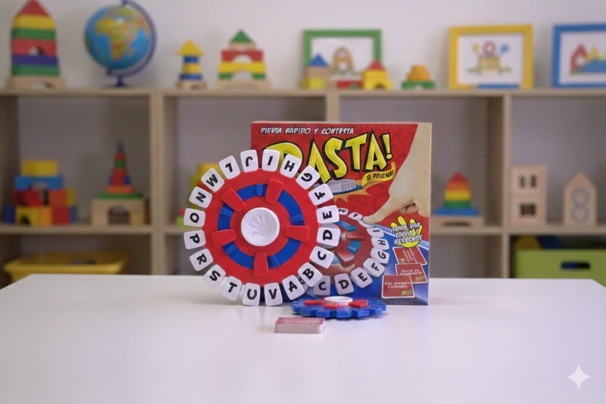 BASTA! es un juego clásico de velocidad verbal y razonamiento, adaptado ahora en formato de ruleta para hacerlo más dinámico y emocionante. El niño gira la ruleta y debe responder rápidamente palabras que empiecen por la letra seleccionada en diferentes categorías (animales, objetos, nombres, colores, etc.).