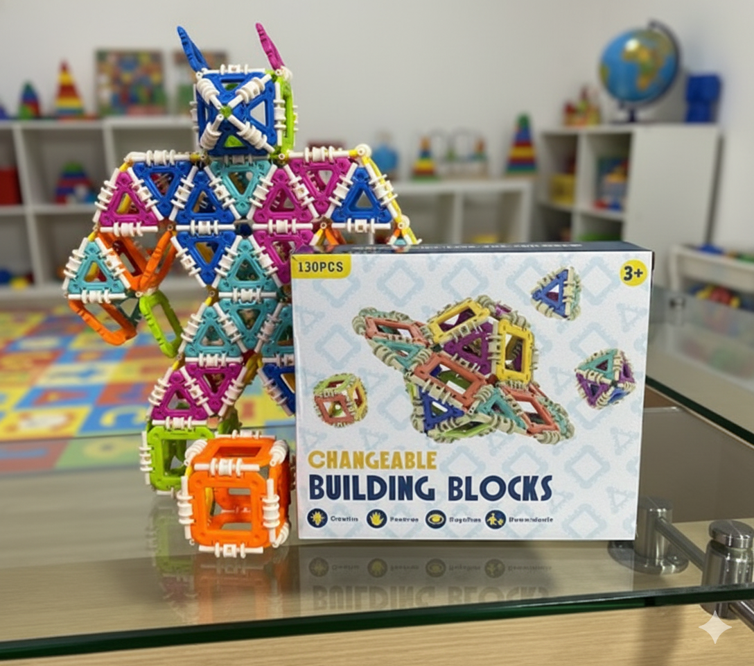 Cada pieza se une mediante ganchos de ensamble seguros y resistentes, que permiten armar estructuras estables y detalladas: desde robots y torres hasta casas, animales o formas abstractas.