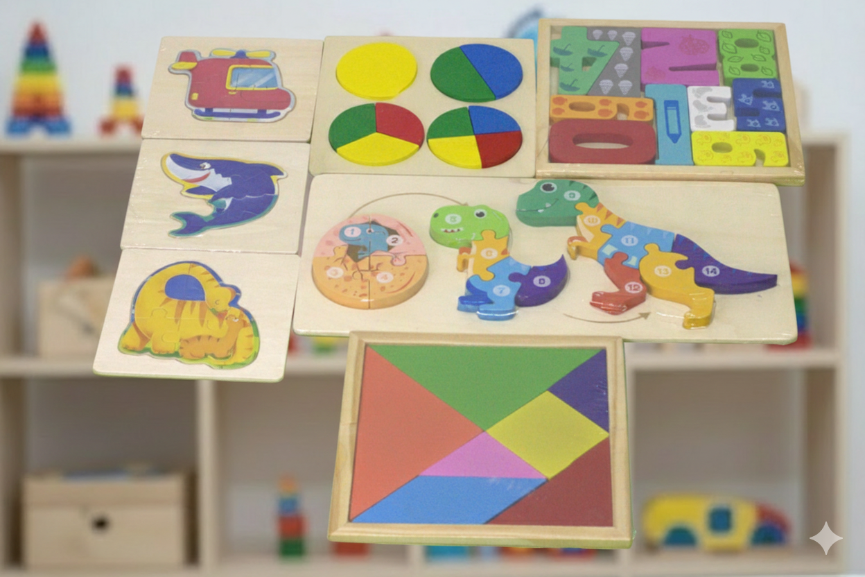 Este kit no es un solo juego, sino un sistema de estimulación escalonado, que va desde encajes simples (formas y colores) hasta estructuras más complejas (rompecabezas secuenciales, figuras fraccionadas y construcción espacial). Está pensado para acompañar procesos de maduración cerebral, especialmente en niños con dificultades de atención, planificación, lenguaje, coordinación o aprendizaje.