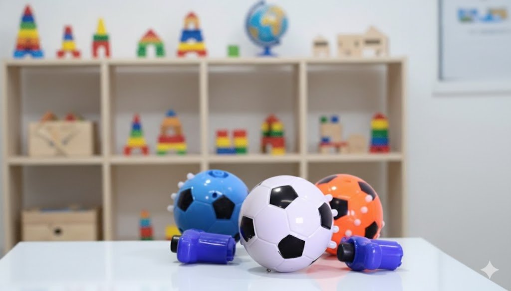 Este juguete es un trompo giratorio con diseño de balón, que se activa al insertar la base y halar el mecanismo. Una vez impulsado, el trompo sale girando rápidamente en el piso, generando movimiento inesperado que captura la atención del niño y lo invita a reaccionar, seguirlo y anticipar su dirección. Funciones neuropsicológicas que estimula