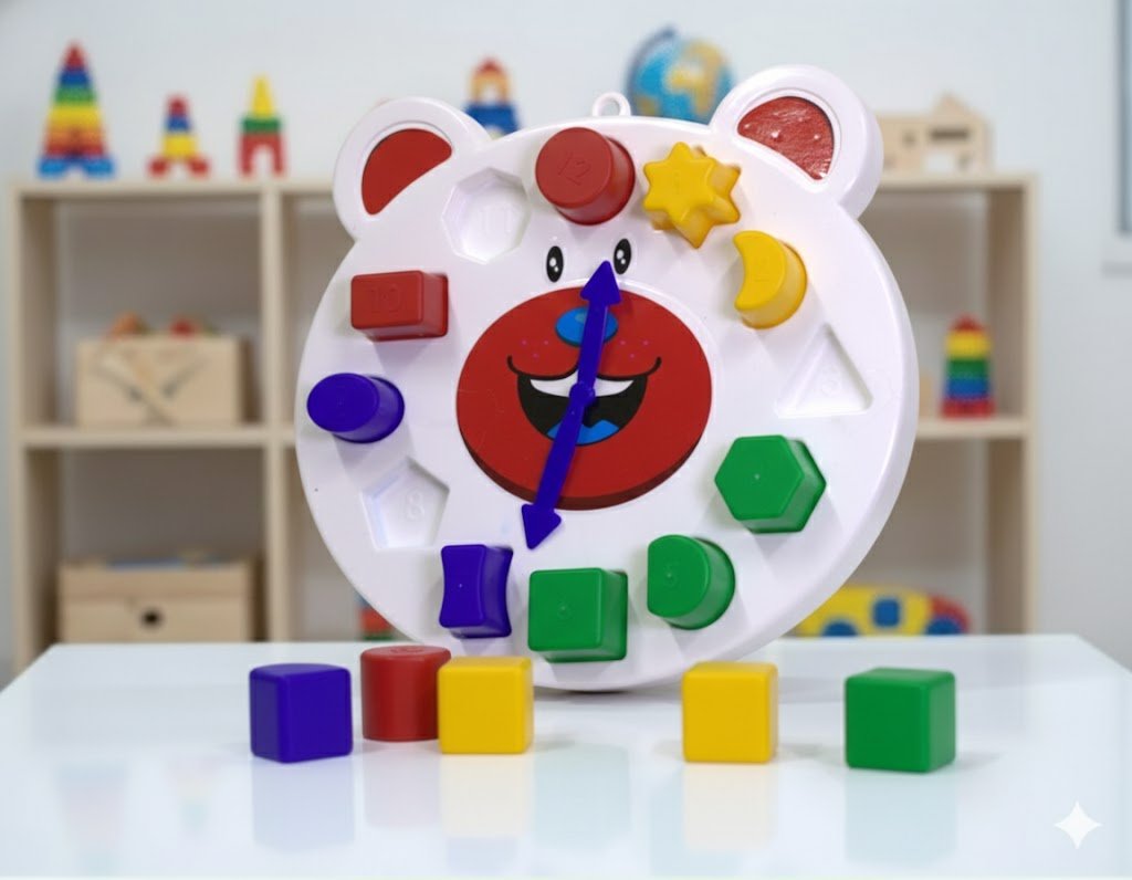 El encaje de formas, el giro de las manecillas y la búsqueda del espacio correcto convierten este juguete en un entrenamiento completo para funciones esenciales del aprendizaje.
