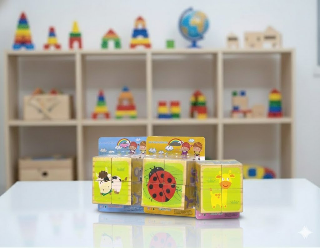 Este rompecabezas de cubos es una herramienta perfecta para niños pequeños que están iniciando en el mundo del razonamiento visual y la resolución de problemas. Cada set incluye cubos ilustrados por todas sus caras, permitiendo armar seis imágenes distintas de animales según cómo el niño gire y combine las piezas.